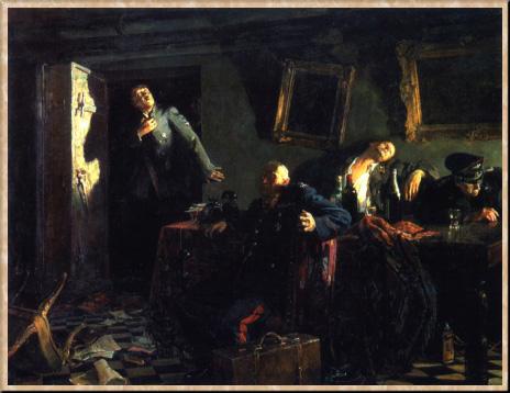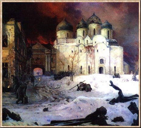 В станковой живописи Кукрыниксы сообща стремились применить к большому холсту свой опыт политической и преимущественно сатирической графики. Уже в 1933 г. они показали серию "Лицо врага" - цикл живописных карикатур на белогвардейских генералов. Отечественная война дала темы для новых больших картин Кукрыниксов: "Зоя Космодемьянская" (1942-47), "Бегство фашистов из Новгорода" (1944-46), "Конец. Последние часы в ставке Гитлера", (1947-48). Здесь делались попытки совместить достоверное изображение событий с карикатурными, гротескно трактованными образами.
