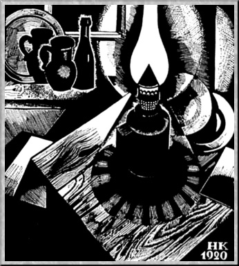 Юрист по образованию (он окончил Петербургский университет), Н. Н. Купреянов занимался в студенческие годы живописью и рисунком в студиях Д. Н. Кардовского и К. С. Петрова-Водкина. Но то, что у него тогда получалось, строгий к себе юноша не воспринимал как искусство. Затем несколько месяцев он учился гравировать на дереве у А. П. Остроумовой-Лебедевой. И именно гравюра дала, по его словам, "самочувствие художника". Гравюрными работами он и вошел в конце 1910-х - начале 1920-х гг. в искусство. Эта техника была тогда на подъеме, утверждалась не просто как одна из многих форм графики, но как созвучный времени резкий и сильный художественный язык. Купреянов активно использовал в своих гравюрах естественную выразительность черного цвета. Их плотная, весомая чернота, оттененная скупо отмеренными белыми штрихами, предстает округлой пластической формой. Он лепит из темной массы могучие тела своих "Битюгов" (три варианта, 1916-18), высекает угловатые грани "Броневиков" (1918) с их тяжелой, но яростной носорожьей подвижностью, крупно строит обобщенные формы в портретах.