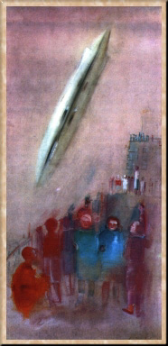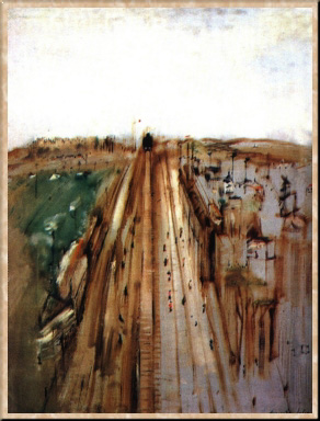 Движение, скорость... Как передать это впечатление в неподвижной живописи? Как выразить ощущение полета, высоты, зыбкой пустоты за тонкими стенами кабины аэроплана? Лабас едва намечает эту повисшую в бесконечности кабину, будто в разрезе, - с пассажирами, спокойно сидящими на почти невидимой опоре; чуть угадываются и крылья, растаявшие в золотистом мареве ("В кабине аэроплана", 1928). Художник изображает не механику, но чудо полета. Он ищет точный ритм движения поезда среди смазанного скоростью расплывающегося пейзажа, и опять - с цветными пятнышками пассажиров в смело разрезанном поперек вагоне ("Едут", 1928). Он пишет без конца паровозы, самолеты, дирижабли, пренебрегая техническими подробностями, но ловя ощущения новизны, подвижности, непривычных точек зрения на вещи - снизу вверх или сверху, с высоты полета. Как мир, который он изображает, сама его живопись легка, подвижна, порой неопределенна, обращена не к предмету, а к чувствам, которые он возбуждает. Он пишет город, уходящий в небеса этажами домов, оживленный людьми, мчащимися в разные стороны трамваями, извозчиками, автомобилями ("Городская площадь", 1926). Пишет бесконечно струящиеся вверх и вниз сквозь гигантскую трубу полосы эскалаторов...