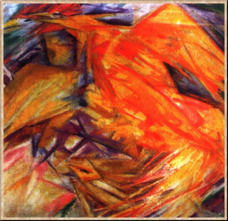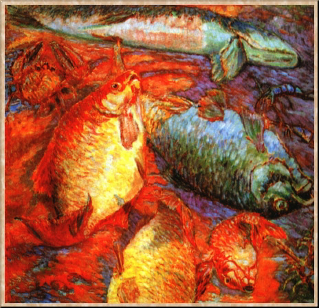 На выставке "Мишень", где демонстрировались также произведения художников-самоучек и детские рисунки, Ларионов представил работы из незавершенного цикла "Венеры" и четыре холста "Времена года" (1912), которые были расценены критиками как вызов. В них использованы язык детского рисунка и архаическая символика, дополненная незатейливым текстом. "Мишень" стала высшей точкой развития художественных идей Ларионова. Уже диспут "Мишени" включал доклад о лучизме, а на выставке экспонировались лучистские картины: "Петух и курица", "Лучистая скумбрия и колбаса" и др. Лучистские произведения Ларионов показывал и на последующих выставках - "14. Футуристы, лучисты, примитив" (1914), "1915 год". В том же 1913 г. Ларионов публикует брошюру "Лучизм", манифест "Лучисты и будущники", в которых формулирует теорию нового течения: "Стиль лучистой живописи имеет в виду пространственные формы, возникающие от пересечения отраженных лучей различных предметов. <...> Луч условно изображается на плоскости цветной линией". В лучизме Ларионова заложены начала абстрактного искусства.