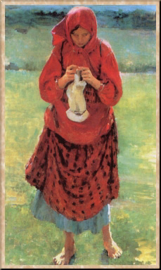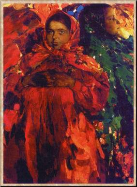 Крестьянки в ярких красочных нарядах - главные персонажи произведений Малявина. К традиционной для русской живописи народной теме художник подошел по-своему, акцентируя мощное стихийное начало в женских образах, придавая им монументальность. Смелая живопись Малявина с ее условными фонами, крупными фигурами, неглубоким пространством и необычайно звучным цветом - подчеркнуто декоративна. Но в начале XX в. ее нередко расценивали как своеобразный вызов. Картина "Вихрь", показанная в 1906 г. на выставке объединения "Мир искусства", воспринималась современниками в непосредственной связи с революционными настроениями эпохи. Надо отметить, что в картинах Малявина впервые после древней иконописи зазвучал в полную силу красный цвет.