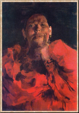Ф. А. Малявин родился в многодетной крестьянской семье. В шестнадцать лет юноша отправился в афонский православный монастырь Святого Пантелеймона и почти шесть лет был послушником, трудился в монастырской иконописной мастерской. В 1891 г. работы художника-самоучки увидел скульптор В. А. Беклемишев, побывавший на Афоне. Он пригласил Малявина в Петербург, поселил у себя. В 1892 г. бывший монастырский иконописец поступил вольнослушателем на живописное отделение АХ. После реформы АХ в 1894 г., когда там открылась мастерская И. Е. Репина, Малявин стал его учеником. Уже ранние работы Малявина - портреты крестьян ("Крестьянская девушка с чулком", 1895; "Старуха", 1898) и соучеников художника по репинской мастерской (И. Э. Грабаря, К А Сомова, А П. Остроумовой) - принесли ему известность. Полотна молодого академиста приобретал для своей галереи П. М. Третьяков, о них писали газеты. Очень скоро художник начал выполнять и эффектные заказные портреты.