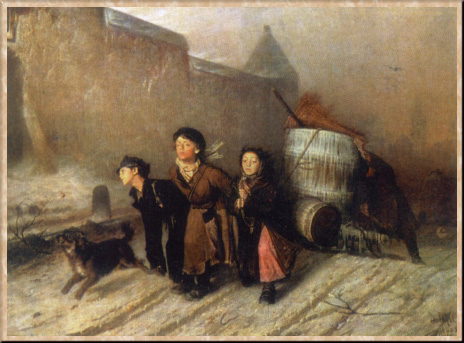 В 1862 г. Перов отправился в Париж, но пробыл там гораздо меньше отпущенного ему срока. Во Франции он чувствовал себя сторонним наблюдателем и никак не мог найти тему для работы. Поэтому ему разрешили продолжить пенсионерство на родине, а когда (в 1868 г.) срок закончился - продлили еще на два года. Это было время взлета его творчества. Несколько картин, исполненных одна за другой и перекликавшихся со скорбной поэзией В. А. Некрасова, на короткий период сделали Перова самым популярным художником России. В полотнах "Проводы покойника" (1865), "Тройка. Ученики-мастеровые везут воду" (1866), "Утопленница" (1867) не было развернутого сюжета, но их немногословность давала пищу для воображения и сочувствия, а монотонная гамма тусклых тонов отвечала угрюмости царившего в них настроения.