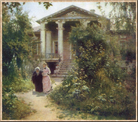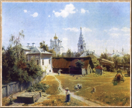 В 1876 г. Поленов возвращается в Россию. В 1878 г. на XII выставке ТПХВ появляется ныне знаменитый "Московский дворик". В этой наполненной солнцем картине художнику удалось соединить непосредственность и свежесть пленэрного восприятия со столь характерным для русской пейзажной традиции целостным и одновременно интимно-теплым ощущением мира. "Московский дворик" - действительно целый мир, в котором каждая деталь выглядит бесконечно значимой и родной; в котором "сходятся" барская усадьба и жилища бедняков; который начинается фигурой ребенка на переднем плане и словно врастает в бездонное небо сверкающими в солнечных лучах маковками церкви. Человеческий мир здесь - часть безбрежно-гармоничного мира природы.