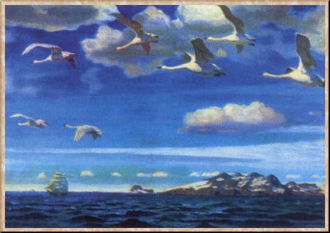 То же радостное чувство и аналогичное пространственное построение - в картине "В голубом просторе" (1918). Изображено весеннее ветреное утро над волнующимся морем, потоки золотистых лучей восходящего солнца, летящие на родину белые лебеди, земля с остатками сходящего снега и легкое парусное судно, устремленное навстречу солнечным лучам. Этот полный веры в жизненные силы образ позже был использован в идеологических целях. Картину объявили первым советским пейзажем, а Рылова - основоположником советской пейзажной живописи.