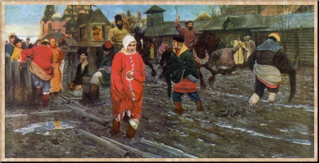 В 1895 г. художник показывает большое полотно "Московская улица XVII века в праздничный день". Среди старинной архитектуры, наряженные в старинные костюмы, бредут по колено в грязи непролазной мужчины и женщины, списанные Рябушкиным с крестьян деревни, где он жил. На лицах - печать извечных житейских проблем. Обычный холодный осенний денек. Обычное передвижническое противопоставление нищеты одних и бездушного эгоизма других. Рябушкин то более склоняется к жанру, как в этой картине, то к внешней красоте старого быта - "Русские женщины XVII века в церкви" (1899). Здесь необыкновенно красивое цветовое соединение ярких узорчатых тканей - синих, желтых, разных оттенков красного; золото волос, венцов, парчовых головных уборов сопоставляется с охристо-зелено-синей росписью стен церкви, с узорами цветных стекол в окнах. Эти две картины и "Семья купца в XVII веке" (1896) получили почетный отзыв на Всемирной выставке в Париже в 1900 г.