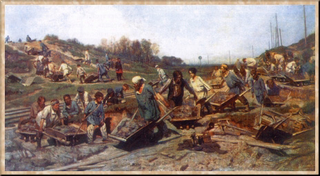 Лето 1873 г. Савицкий вместе с И. Н. Крамским проводит на станции Козловка-Засека под Тулой, где "возгорается" замыслом картины "Ремонтные работы на железной дороге" (1874) - первого и одного из наиболее значительных своих произведений. Вслед за Репиным, написавшим за год до того "Бурлаков", Савицкий в картине отражает не отдельный, пусть даже значимый, факт, а целое явление современной ему жизни, сохраняя естественность и непреднамеренность жизненной сцены. Главным героем монументального полотна становится крестьянство. В сложной, но мастерски построенной композиции, где представлено огромное количество людей, движущихся в различных направлениях, Савицкому удалось прекрасно передать ритм и напряженность тяжелейшего труда крестьян, ставших рабочими-поденщиками на строительстве железной дороги. Здесь впервые с небывалой силой проявилось то "хоровое начало" (В. В. Стасов), которое будет свойственно творчеству художника и позднее. Двое персонажей первого пл ана (мужчины с гружеными тачками) намеренно выделены среди остальных, в них подчеркнуты сила, упорство, решительность. Колорит картины строится на тональном единстве серых, желтых, сине-серых, коричневых красок.