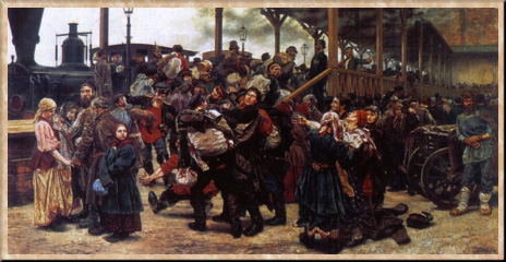 Над картиной "На войну" Савицкий начал работать в 1880 г., выполнил ее первый вариант, который впоследствии разрезал на части. Во втором варианте полотна (1888) художник стремился к решению новой задачи - созданию живописной эпопеи. Изображены проводы на войну, идут последние минуты прощания. Композиция строится из отдельных групп; каждая группа - семья, провожающая своего кормильца. Одни персонажи - сдержанны, мужественны, другие - во власти эмоций и переживаний, но всех объединяет общая беда. В цветовом решении полотна художник отказывается от тонального колорита своих ранних картин и работает локальными пятнами, яркими, но уравновешивающими друг друга.