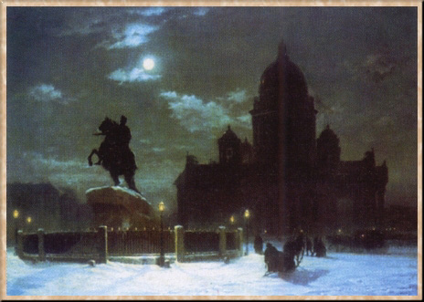 В 1870 г., еще на академической скамье, создал он свою первую значительную картину - "Вид памятника Петру I на Сенатской площади в Петербурге". Картина была куплена сибирским золотопромышленником П. И. Кузнецовым, а позже поступила в Красноярскую художественную галерею. Сибирь гордилась своим земляком. Авторское повторение этой картины (также 1870) ныне украшает экспозицию ГРМ.