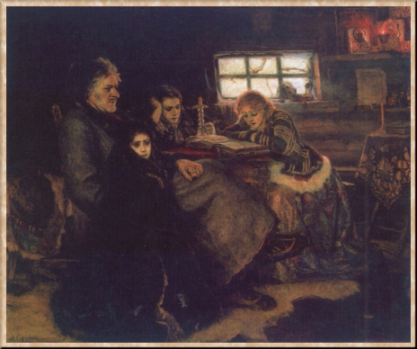 Еще в Сибири слышал он рассказы о любимце и сподвижнике Петра I, который после смерти своего покровителя обрел небывалую полноту власти, но скоро потерпел полное крушение, впал в немилость, потерял титулы и имущество и был сослан в Сибирь. По дороге, в Казани, умерла жена Меншикова. Горе осиротевшей, обездоленной семьи, загнанной в "медвежий угол", в глухой сибирский городок, - только одна из сюжетных линий картины. Изобразив светлейшего князя, генералиссимуса, "птенца гнезда Петрова", в окружении сына и двух дочерей, сидящим за столом в низкой светелке, Суриков намеренно сузил пространство. "Если ваш Меншиков встанет, - сказал Крамской, увидев картину на XI выставке ТПХВ, - то он пробьет головой потолок". И это не случайно. Низкий потолок, тесная и темная изба только подчеркивали мощь и монументальность фигуры некогда "полудержавного властелина".
