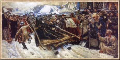 После того как на передвижной выставке 1883 г. П. М. Третьяков приобрел "Меншико-ва в Березове" для своей галереи, Суриков получил средства для зарубежной поездки. Он побывал в Германии, Италии, Франции, Австрии, видел коллекцию Дрезденской галереи, собрание Лувра, познакомился с творениями итальянских и испанских мастеров. Однако возникший еще до поездки замысел новой исторической картины - "Боярыня Морозова" - не оставлял художника в покое даже за границей. Суриков вновь избрал трагический момент русской истории: время раскола русской Церкви в середине XVII в., фанатической борьбы старообрядцев с нововведениями патриарха Никона при царе Алексее Михайловиче. Раскольничество опальной боярыни Федосьи Морозовой воспринималось как религиозный бунт, как яростный протест народа против посягательств на его веру.