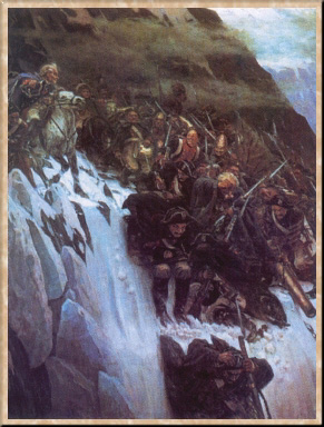 Теме мужества и героизма русских солдат посвящена и картина "Переход Суворова через Альпы" (1899). Бесстрашие людей, преодолевающих неприступные заснеженные скалы, отвага и смелость полководца воплощены в сильных и выразительных образах. "Двигаются, покорные слову вождя", - заметил художник по поводу сюжета своей картины.