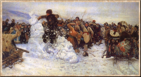 В 1891 г. Суриков написал новую большую картину, на этот раз не историческую, а на современный сюжет, - "Взятие снежного городка". Показана удалая сибирская игра, когда всадник должен перескочить сооруженную из снега стену. Молодые улыбающиеся лица, яркие одежды, искрящийся на солнце снег - все проникнуто неподдельным весельем. Подобная картина была исключением в творчестве Сурикова, который вскоре вновь вернулся к серьезной исторической тематике. "Покорение Сибири Ермаком Тимофеевичем" (1895) стало следующим монументальным полотном. Историческое событие трехсотлетней давности - бой казачьей флотилии Ермака и войск хана Кучума - художник показал с достоверностью очевидца. "А я ведь летописи не читал. Она (картина) сама мне так представилась: две стихии встречаются. А когда я, потом уж, Кунгурскую летопись начал читать, вижу - совсем как у меня. Совсем похоже", - вспоминал художник. В сложной многофигурной композиции, полной движения и экспрессии, запечатлен подвиг русских воинов во имя освобождения родной земли.