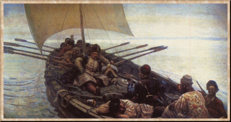Следующей, законченной к 1910 г., исторической картиной Сурикова стало его знаменитое полотно "Степан Разин". Почти все пространство картины занимает огромная ладья, плывущая по широкому волжскому простору. В центре, на покрытой ковром скамье, - монументальная фигура Разина, атамана-бунтаря, погруженного в тяжкую думу. В мускулистых фигурах гребцов - напряжение и сила, воплощение мощи народа.