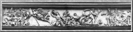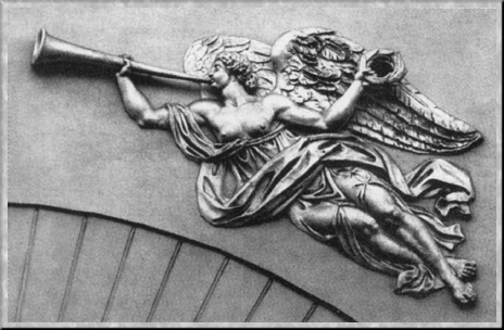 Во фронтоне восточного портика Теребенев изобразил многофигурную композицию "Афина, венчающая труды художников"; во фронтоне западного портика - "Афина, награждающая за военные и морские подвиги". Над главными воротами помещены рельефные фигуры летящих Слав. Представленные в стремительном движении, они осеняют своими победными знаменами всех входящих в Адмиралтейство - центр русского флота. Аналогичны по содержанию и пластике фигуры Слав, изображенные на невских павильонах, но движение их еще более динамично: держа в руках лавровые венки и трубя победную песнь, они устремляются навстречу друг другу. Органично связанные с закруглением арки, фигуры и композиционно, и пластически, и идейно продолжают и развивают выраженную в архитектуре здания тему триумфа. Впоследствии подобный мотив мы встретим в русской архитектуре неоднократно, блестящее продолжение он получит в архитектурно-пластическом решении арки Главного штаба.