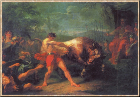 К национальной патриотической тематике обратился Угрюмов и в другой своей картине - "Испытание силы Яна Усмаря" (1796-97). В основу сюжета положено летописное сказание о киевском кожемяке Яне Усмаре, который вызвался продемонстрировать перед князем Владимиром свою силу, чтобы получить право сразиться с печенегами, вступив в единоборство с их богатырем. Для доказательства он должен был остановить на бегу разъяренного быка. Следование античным традициям - одно из основных требований классицизма - соблюдено художником в полной мере. Ян Усмарь, атлетически сложенный, как античный герои, представлен не в одежде ремесленника, а полуобнаженным, с драпировкой у пояса. Красный цвет драпировки является доминирующим колористическим акцентом, дополняющим динамику сцены, подчеркивающим мощное движение главного героя. За эту картину Угрюмов был удостоен звания академика. Успех этого произведения предопределил дальнейший путь художника.