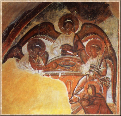 В куполе храма изображена полуфигура Христа Пантократора, окруженная архангелами и серафимами. В барабане - изображения праотцев, среди которых Адам, Авель, Ной, Сиф, Мельхиседек, Енох, пророки Илия, Иоанн Предтеча. На хорах в северо-западной угловой камере (Троицкий придел) изображения сохранились лучше. Придел расписан изображениями святых, композициями "Богоматерь Знамение с архангелом Гавриилом", "Поклонение жертве", "Троица". Манера Феофана ярко индивидуальна, отличается экспрессивностью темпераментом, свободой и разнообразием в выборе приемов. Форма подчеркнуто живо писна, лишена детализации, строится с помощью сочных и свободных мазков. Приглушенный общий тон росписи контрастирует с яркими белильными высветлениями, подобно вспышкам молний освещающими суровые, одухотворенные лики святых. Контуры очерчены мощными динамичными линиями. Складки одежд лишены детальной моделировки, ложась широко и жестко, под резкими углами. Палитра мастера скупа и сдержанна, в ней преобладают оранжево-коричневый, серебристо-голубой, соответствующие напряженному духовному состоя нию образов. "Живопись Феофана - это философская концепция в красках, притом концепция достаточно суровая, далекая от обыденного оптимизма. Суть ее составляет идея глобальной греховности человека перед Богом, в результате которой он оказался почти безнадежно удаленным от него и может только со страхом и ужасом ожидать прихода своего бескомпромиссного и безжалостного судьи, образ которого с крайней суровостью взирает на грешное человечество из-под купола новгородского храма",- пишет исследователь русского средневекового искусства В. В. Бычков. Феофан Грек создает мир, полный драматизма, напряжения духа. Его святые суровые, отстраненные от всего вокруг, углубившиеся в созерцание безмолвия - единственного пути к спасению.