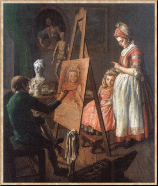 Судя по лицам, костюмам, обстановке - изображены французы. Мальчик-живописец перед большим мольбертом пишет портрет маленькой девочки, которая устала от долгого позирования. Стоящая рядом с ней молодая женщина, вероятно, уговаривает ее посидеть еще немного. Фирсов замечательно передает естественность поз и движений. Мастерскую заливает ровный солнечный свет. На стенах - картины, на столе - женский мраморный бюст, несколько книг и манекен из папье-маше, изображающий фигуру человека. В русской живописи того времени трудно найти столь же непринужденно, свободно переданное пространство. Колорит картины розово-серый, серебристый.
