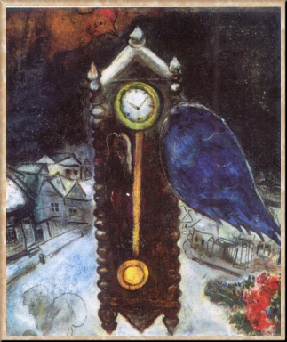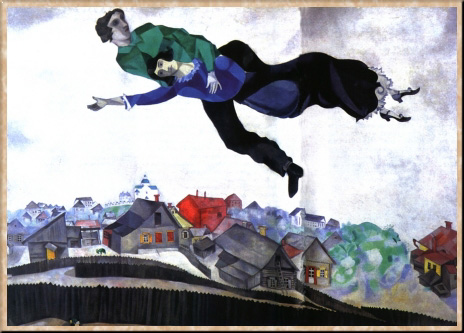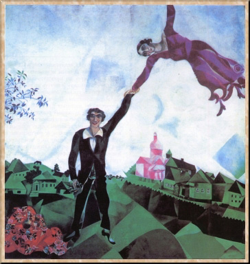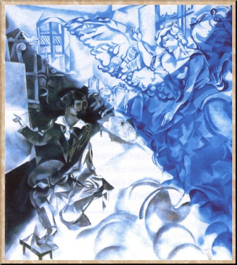 Летом 1914 г. Шагал вернулся в Россию. Художник как бы заново открыл родной Витебск, и фантастическая экспрессия парижских видений уступила место лирической интонации картин милого сердцу быта ("Вид из окна. Витебск", "Парикмахерская", "Дом в местечке Лиозно", все 1914, и др.). Впрочем, одно не отменяет другое, обе линии тесно сплетаются. Всю жизнь писав ший стихи, Шагал перенес в живопись чисто поэтические приемы, из которых нужно особо выделить реализацию метафоры. Его герои совершают прогулки в небесах так же естественно, как если бы они шли по земле ("Над Витебском", 1914; "Прогулка", 1917; "Над городом", 1914-18), небесные гости в клубах облаков являются к художнику в мастерскую ("Автопортрет с музой (Видение)", 1917-18). Вещи в картинах и рисунках Шагала обладают как бы человеческими повадками, характерными лицами ("Окно в сад", ок. 1917; "Интерьер с цветами", 1918, и др.), а подчас вырастают до пространственно-временных символов космического масштаба ("Часы", 1914; "Зеркало", 1915).