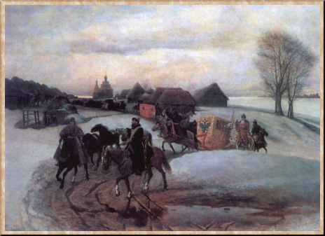 К лучшим работам Шварца этого периода относится полотно "Вешний поезд царицы на богомолье при царе Алексее Михайловиче" (1868). В нем художник не только археологически точно изобразил типы, одежды и предметы старины, но и создал изумительно тонкий, поэтичный пейзаж России с необозримыми, теряющимися в легкой дымке заснеженными далями.