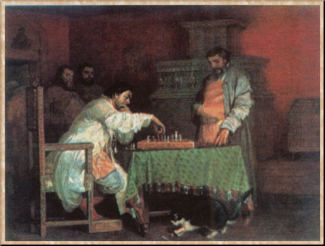 В 1863 г. Шварц направился в Париж, где занимался в мастерской исторического живописца Ж. Лефевра, а также выполнил живописный вариант своего картона "Иван Грозный у тела убитого им сына" (1864). Возвратившись в 1864 г. в Россию, художник вновь обратился к излюбленной теме жизни и быта русских царей, в изучении которой опирался на труды историков Н. И. Костомарова и И. Е. Забелина. В кремлевской Оружейной палате он рисовал с натуры утварь, одежду, оружие и предметы обихода XVII столетия. В результате глубокого и кропотливого исследования быта эпохи им были созданы картины "Сцена из домашней жизни русских царей (Игра в шахматы)" (1865), "Иностранные посланники в посольском приказе", "Патриарх Никон в Новом Иерусалиме" (обе 1867) и др. В них сказалось знание историко-бытовых деталей, благодаря которым художнику удалось воссоздать верный типаж, а также атмосферу будничной жизни теремов-дворцов.