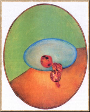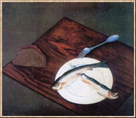 Конечно, Штеренберг тоже новатор, - картины, которые он начинает выставлять, не похожи на привычную старую живопись. Но они строго изобразительны и очень конкретны. Почти всегда это натюрморты, изображения простых вещей. Ничего специально красивого: губка и мыло. Керосиновая лампа. Нож. Бутылка. Две селедки на блюде и полбуханки черного хлеба... Одна, самое большое - три вещи, грубые и бедные, на голой пустоте холста, подчеркнуто плоскостного, лишенного и пространственной глубины, и объединяющей, обволакивающей предметы атмосферы. Зато подчеркнут материал, структура поверхности вещей: гладкий фаянс и шероховатая хлебная корка, слоистая доска и скользкая рыбья чешуя. Художник прибегает даже к рельефу - некоторые изображения выступают из поверхности холста. Обращаясь к зрению, такая живопись возбуждает скорее осязательные, материально-конкретные ощущения. Одинокие предметы будто просятся из нее наружу, в живые человеческие руки. Простейший натюрморт насыщен драматическим напряжением, говорит нам об элементарных, но необходимых человеческих ценностях. "Вся его живопись есть рассказ о хлебе насущном, которого надо припасти так немного, чтобы прожить, но над которым надо помучиться так много, чтобы достать", - сказал о Штеренберге проницательнейший художественный критик А. М. Эфрос.