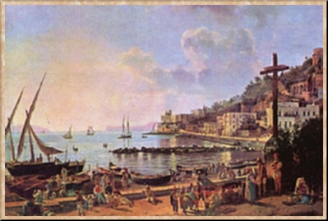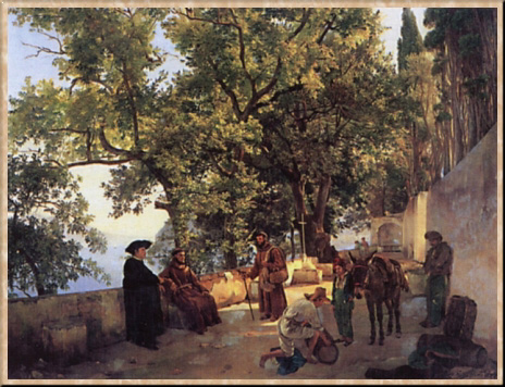 Срок пенсионерства истек в 1823 г., но Щедрин рискнул остаться в Италии еще на некоторое время - уже независимым художником, благо его работы имели спрос, который он едва успевал удовлетворять. В 1825 г. Щедрин вновь оказался в Неаполе. Там он главным образом проводил время в холодные месяцы, а в теплые - писал с натуры в маленьких городках, расположенных вдоль побережья Тирренского моря. Особенно его привлекали скалистые берега, окружавшие небольшие уютные бухты, - он писал их по многу раз, отыскивая новые и новые места, неоднократно возвращаясь к полюбившимся и открывая в них что-то незнакомое ("Вид Сорренто близ Неаполя", "Вид Амальфи близ Неаполя", обе 1826; "Грот Матримонио на острове Капри", 1827, и др.). Художник увлекся еще одним мотивом - увитой виноградом террасой с видом на море. В многочисленных "Террасах", написанных в 1825-28 гг. и тоже имевших большой успех, он воплощал близкий ему идеал гармонической жизни людей в единении с благодатной природой.