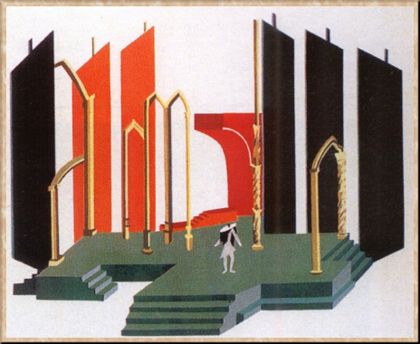 В 1915 г. Экстер примкнула в Москве к группе К. С. Малевича. В это же время она проявила интерес к прикладным искусствам, использовав кубистические формы для создания бытовых вещей. Самой яркой страницей творческой биографии художницы стала ее работа в Московском Камерном театре. Ей принадлежали росписи вестибюля театра и занавес, оформление драмы "Фамира Кифаред" И. Ф. Анненского (1916), "Саломеи" О. Уайльда (1917), "Ромео и Джульетты" У. Шекспира (1921). Костюмы и декорации Экстер особенно впечатляли своей трехмерностью, подчеркнутым пла-стицизмом и звучностью цвета.