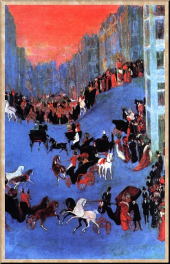 По возвращении из Манчжурии на выставке Московского товарищества художников в 1906 г. Якулов показал свою картину "Скачки". Она имела успех. В этом и других произведениях Якулова, отличавшихся богатым колоритом, отражались ритмы современности, оживала жизнь городских улиц и кафе. В 1906-07 гг. художник разработал собственную теорию света и происхождения стилей в искусстве, получившую название "Теория разноцветных солнц". Знакомство Якулова в 1913 г. с Р. и С. Делоне в Париже показало, что его поиски шли в русле исканий современных европейских художников.