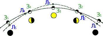 Схема перемещения Земли и Луны в пространстве и изменение их взаимного положения по отношению к Солнцу показаны на схеме.