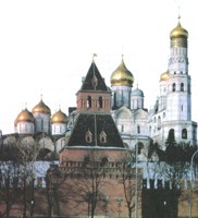 Московский Кремль — всемирно известный памятник. Существующие ныне кирпичные стены были построены в 1485 — 1495 гг. Кремль имеет 20 башен. Одновременно со стенами и башнями шло строительство главных кремлевских соборов - Успенского (1475 - 1479), Благовещенского (1484 — 1489), Архангельского (1505 — 1508). Воздвигалась церковь «под колоколы» (1505 — 1508), которая в 1600 г. была надстроена еще на два яруса, до высоты 81 м, и получила название «Иван Великий». Из старых царских дворцовых зданий до нашего времени дошли лишь Грановитая палата (1487 - 1491) и Теремной дворец (1635 — 1636), которые в XIX в. были соединены с Большим Кремлевским дворцом. К дворцу примыкает здание Оружейной палаты (1844 -1851), где хранятся художественные ценности V — нач. XX в. Неподалеку от соборов - два замечательных памятника русского литейного искусства -Царь-пушка (XVI в.) и Царь-колокол (XVIII в.). На главной площади России -Красной — находится замечательный памятник русской архитектуры — Покровский собор — Храм Василия Блаженного (1555 — 1560), возведенный в честь победы над Казанским ханством. Недалеко от Кремля на берегу Москвы-реки восстановлен в конце XX в. храм Христа Спасителя, воздвигнутый в 1837 -1883 гг., как памятник победы России в 1812г. Большевики в 1931 г. взорвали храм.