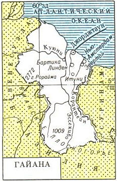 ГАЙАНА (Кооперативная Республика Гайана), государство на С.-В. Юж. Америки, омывается Атлантическим океаном. Пл. 215 тыс. км2. Население 712 тыс. чел., гайанцы (в т.ч. св. 1/2 выходцы из Юж. Индии, св. 1/2 негры, св. 1/10 метисы и мулаты). Официальный яз. - английский. Верующие - протестанты, индуисты, католики, мусульмане. Глава государства и правительства - президент. Законодательный орган - Национальное собрание. Столица - Джорджтаун. Адм. деление: 10 р-нов. Денежная единица - гайанский доллар.
