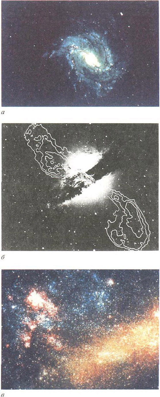 Галактики: а - типичная спиральная галактика; б - эллиптическая галактика Кентавр А с необычайно широкой полосой пыли (приведены также линии равной интенсивности радиоизлучения); в - неправильная галактика Большое Магелланово Облако.