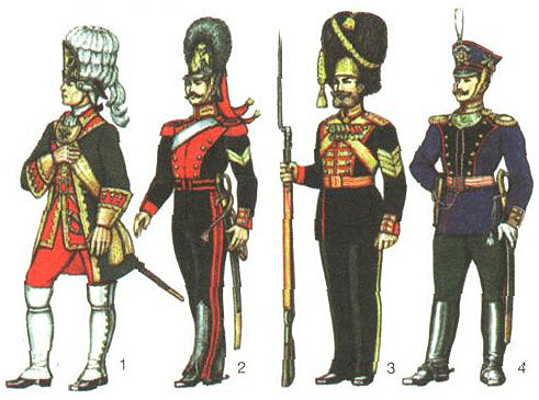Гвардия: 1 - обер-офицер лейб-гвардии Преображенского полка, 1740; 2 - рядовой лейб-гвардии Конно-гренадерского полка, 1841-48; 3 - рядовой роты Дворцовых гренадер, 2-я пол. 19 - нач. 20 вв.; 4 - обер-офицер лейб-гвардии Первой артиллерийской бригады, 1911.