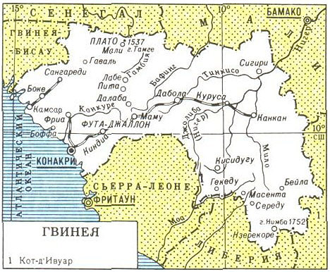 В 1880-90-х гг. территория Гвинеи захвачена Францией, в 1895 выделена в отдельную колонию (под названием Французская Гвинея), которая вошла во Французскую Зап. Африку. С 1958 независимое государство. В декабре 1990 принята конституция, предусматривающая переход к многопартийной политической системе.