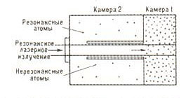 Давление света. Схема разделения газов при помощи резонансного светового давления (частота света ла-равна частоте атомного перехода). Резонансные атомы под действием света, получив направленный импульс от световых квантов, перейдут в дальнюю камеру.