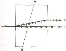 Двойное лучепреломление (схема): MN - направление оптической оси; о - обыкновенный луч; е - необыкновенный луч.