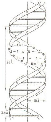 ДЕЗОКСИРИБОНУКЛЕИНОВАЯ КИСЛОТА (ДНК), высокомолекулярное природное соединение, осн. компонент хромосом всех организмов. ДНК - носитель генетической информации, её отдельные участки соответствуют определённым генам. Молекула ДНК образована 2 цепями, закрученными одна вокруг другой в спираль (двойная спираль). Цепи состоят из мономеров - нуклеотидов, различающихся одним из 4 азотистых оснований (аденин, гуанин, цитозин, тимин). Определённое сочетание из трёх соседних нуклеотидов в гене (триплет, или кодон) - единица генетического кода. Последовательность нуклеотидов в ДНК каждого организма строго индивидуальна и определяет его особенности (признаки). ДНК точно воспроизводится при делении клеток, что обеспечивает передачу наследственной информации в ряду поколений. Самопроизвольное или вызываемое различными воздействиями нарушение структуры ДНК может привести к наследственным изменениям - мутациям. Структура ДНК установлена в 1953 Д. Уотсоном (США) и Ф. Криком (Великобритания).