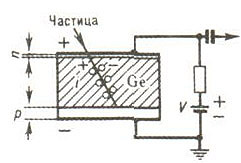 Детектор. Схематическое изображение полупроводникового детектора (штриховкой выделена чувствительная область): п - полупроводник с электронной проводимостью; р - полупроводник с дырочной проводимостью; Ge - германий, имеющий собственную проводимость (i); V- напряжение постоянного источника.