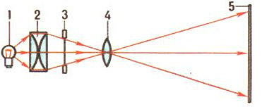 Диапроектор (оптическая схема): 1 - источник света (проекционная лампа); 2 - конденсор; 3 - диапозитив (слайд), диафильм; 4 - объектив; 5 - экран.