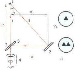 Дальномер. Принципиальная схема оптического монокулярного дальномера фотоаппарата (а) и видимые через окуляр изображения объекта съёмки при сфокусированном (б) и несфокусированном (в) объективе; I и II - световые лучи, идущие от объекта по двум оптическим системам (ветвям) - основной (I) и вспомогательной (II); 1 - объект; 2 - оптический компенсатор; 3 - полупрозрачное зеркало; 4 - окуляр; О - параллактический угол; Б - база дальномера; х - расстояние до объекта съёмки.