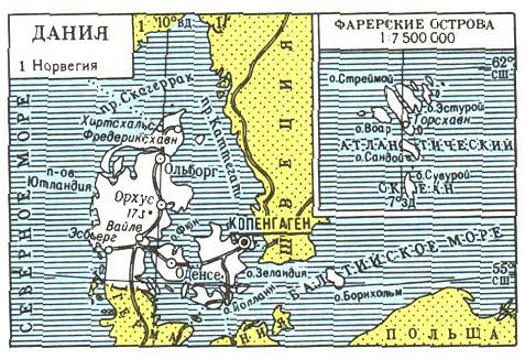 ДАНИЯ (Королевство Дания), государство в Сев. Европе, на полуострове Ютландия, прилегающих островах (Зеландия, Фюн, Лолланн, Фальстер и др.) и острове Борнхольм. Омывается Северным и Балтийским морями и соединяющими их проливами - Скагеррак, Каттегат и др. Пл. 43,1 тыс. км2 (без Фарерских островов и острова Гренландия). Население 5,2 млн. чел.; св. 97% - датчане. Официальный язык - датский. Верующие - лютеране. Дания - конституционная монархия. Глава государства - король (королева). Законодательный орган - Фолькетинг. Правительство возглавляет премьер-министр. Столица - Копенгаген. Адм.-терр. деление: 14 амтов. В составе Дании - Фарерские острова и Гренландия. Денежная единица - датская крона.