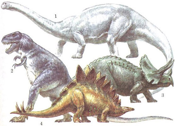 бронтозавр (апатозавр); 2 - тираннозавр; 3 - трицератопс; 4 - стегозавр.