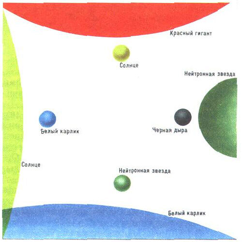 Звёзды. При одной и той же массе звёзды могут иметь существенно различные размеры (показаны размеры Солнца по сравнению с красным гигантом, белого карлика по сравнению с Солнцем и т.д.).