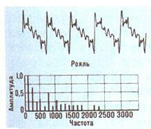 Звук. Форма колебаний (сверху) и частотно-амплитудный спектр (снизу) звуков рояля (основная частота 128 Гц).