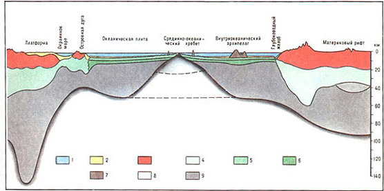 Земная кора, строение: 1 - вода; 2 - осадочный слой; 3 - гранитный слой; 4 - базальтовый слой континентальной коры; 5 - базальтовый слой океанической коры; 6 - магматический слой океанической коры (породы габброидного состава); 7 - вулканические острова; 8, 9 - мантия (ультраосновные магматические породы), расположенная ниже коры.