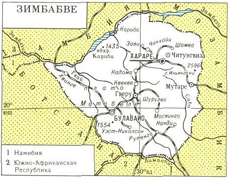 Почти всю территорию Зимбабве занимают плато Матабеле и Машона высотой 800-1500 м, наибольшая высота 2596 м (гора Иньянгани) в горах Иньянга, на С. плато понижается к долине реки Замбези, на Ю.- к долине реки Лимпопо. Климат в сев. части субэкваториальный, в южной - тропический. Средние температуры самого тёплого месяца (января) 21-27 oС, самого холодного (июля) 10-17 °С; осадков от 300-700 мм в год на Ю.-З. до 2000 мм на В. Крупное водохранилище - Кариба. Опустыненные саванны и саванные редколесья.