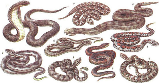 Змеи: 1 - кобра; 2 - эфа; 3-8 - гадюки: 3 - гюрза, 4 - обыкновенная, 5 - степная, 6 - рогатая, 7 - кавказская, 8 - малоазиатская; 9 - щитомордник.