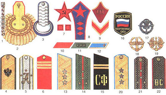 Знаки различия военнослужащих: 1-6 - знаки различия Российской армии, начало 20 в.: 1 - гусарские наплечные шнуры (поручик, подполковник, генерал-лейтенант); 2 - эполеты генерал-майора; 3 - кавалерийские эполеты нижних чинов (6-й уланский Волынский полк); 4 - погоны контр-адмирала; 5 - погоны войскового старшины Амурского казачьего дивизиона; 6 - погоны старшего унтер-офицера гвардейской пехоты; 7-9 - знаки различия РККА: 7 - нарукавный знак командира роты, 1919; 8 - нарукавный знак командарма (кавалерия), 1922; 9 - петлицы и нарукавный знак полковника (пехота), 1935; 10-12 - образцы петлиц РККА и Советской Армии: 10 - 1919; 11 - 1941; 12 - 1970-90-е гг.; 13-15 - погоны: 13 - генерал-полковника ВВС; 14 - капитана; 15 - старшины ВМФ 2-й статьи; 16 - 22 - знаки различия Вооружённых Сил Российской Федерации (1994): 16 - нарукавный знак; 17-19 - эмблемы родов войск: 17 - воздушно-десантные войска; 18 - авиация; 19 - войска связи; 20-22 - погоны: 20 - генерал-полковника авиации и воздушно-десантных войск; 21 - капитана сухопутных войск; 22 - рядового сухопутных войск.