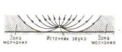 Зоны молчания при распространении звука в атмосфере. Стрелки показывают ход звуковых лучей при убывании температуры воздуха атмосферы с высотой.